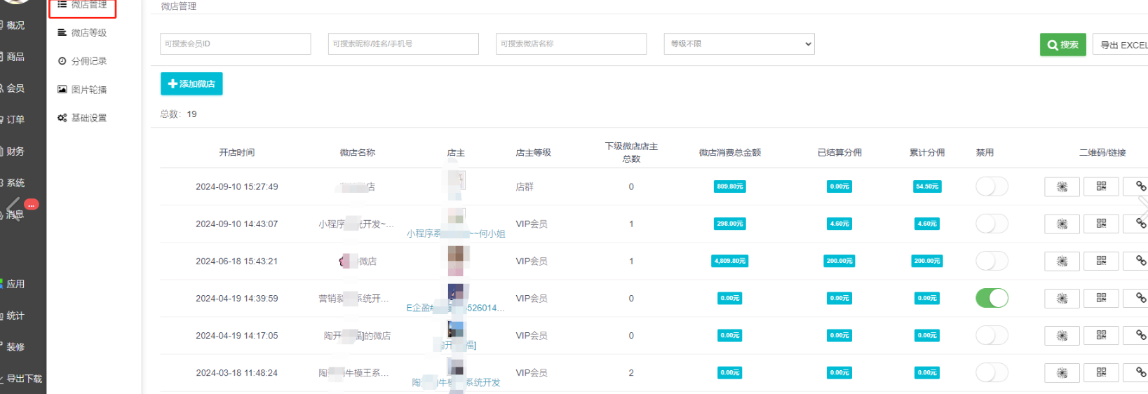 平台通过微店管理列表查看微店店主情况:开店时间、微店名称、店主昵称头像、店主等级、下级微店店主总数、微店消费总金额、微店分红、微店二维码、链接、是否加入黑名单。